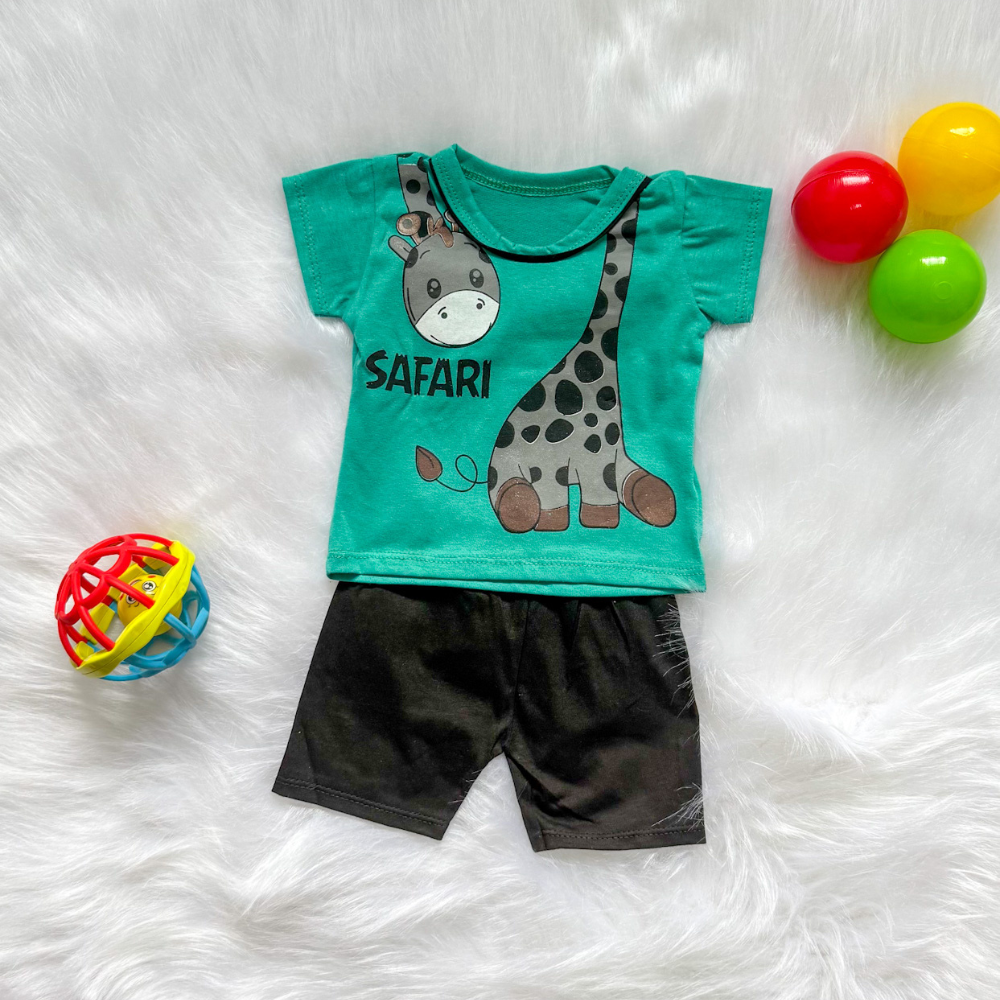 Conjunto Camiseta Manga Curta Safári Verde e Shorts Preto Bebê Menino, tamanho 3/6 meses (dependendo do bebê), 100% Algodão, uma escolha perfeita para os nossos Mini Queridos.