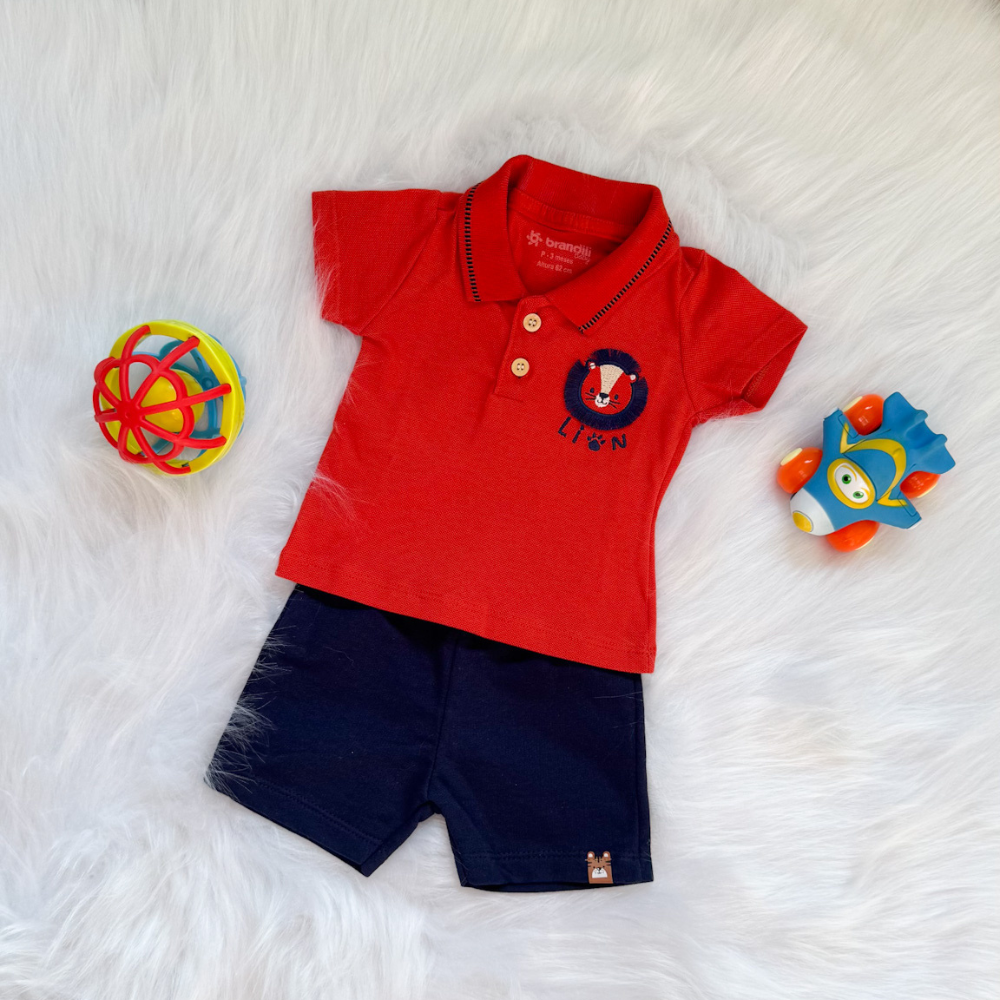 Conjunto Camiseta Polo Lion Vermelho e Bermuda Bebê Azul Marinho Menino – Tamanho P (3 meses, dependendo do bebê), uma escolha perfeita para os nossos Mini Queridos.