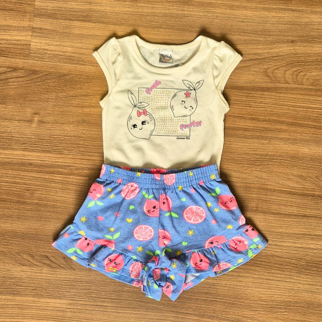 Conjunto Infantil Boca Grande – Blusa Estampada Off White com Brilho, possui decote redondo com mangas curtas e Shorts Estampado Azul – tamanho 1, uma escolha perfeita para as nossas Mini Queridas.