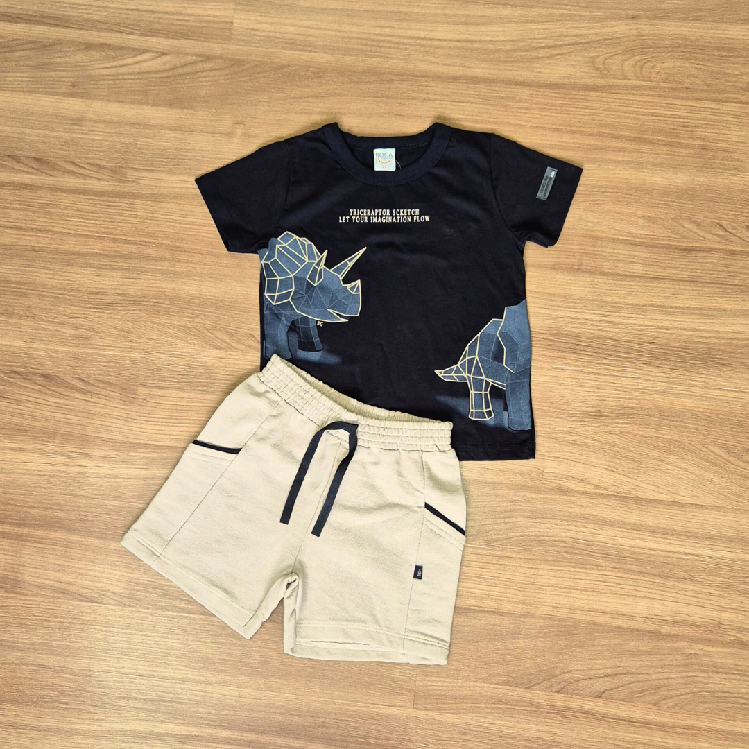 Conjunto Infantil Boca Grande – Camiseta Preta Estampada Com Relevo e Bermuda Bege com bolsos, tamanho 2.