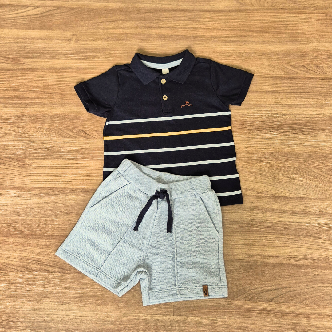 Conjunto Infantil Glinny – Camiseta Polo Preta Listrada e Bermuda Cinza com bolsos, tamanho 1.